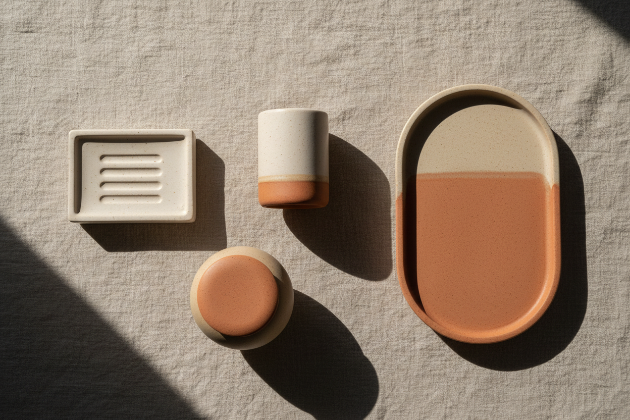 Acessórios artesanais em cerâmica para transformar seu banheiro e lavabo. Peças únicas feitas à mão com acabamento fosco e textura natural, unindo funcionalidade e beleza.