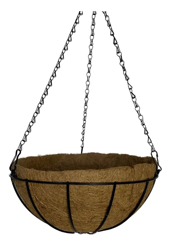 FICHA TÉCNICA - Altura: 10cm - Diâmetro: 20cm - Comprimento corrente: 40cm - Material da estrutura: Ferro - Material do vaso: Fibra de Coco - Durabilidade: A fibra de coco usada como vasos de plantas dura anos, se decompondo aos poucos e servindo até de adubo orgânico. - A água passa pelo material - Acompanha gancho para pendurar - Aguenta peso de até: 10kg - Pode ficar exposto ao sol e à chuva - Cor única.