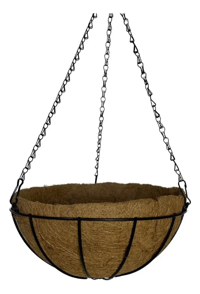 FICHA TÉCNICA - Altura: 10cm - Diâmetro: 20cm - Comprimento corrente: 40cm - Material da estrutura: Ferro - Material do vaso: Fibra de Coco - Durabilidade: A fibra de coco usada como vasos de plantas dura anos, se decompondo aos poucos e servindo até de adubo orgânico. - A água passa pelo material - Acompanha gancho para pendurar - Aguenta peso de até: 10kg - Pode ficar ao ar livre, resistente a sol e chuva - Cor única.